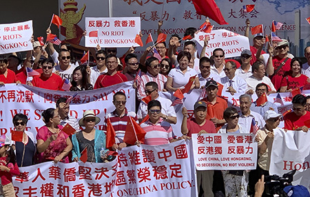 鹿強說:“今天,華僑華人聚集在這裡,就是要向‘港獨’分子發出我們的聲音:反暴力,反‘港獨’,愛香港,愛中國。暴亂解決不了任何問題。海外華僑華人希望香港盡快恢復穩定。”