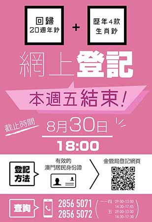 【特訊】澳門回歸祖國二十週年鈔及歷年已發行的四款生肖鈔(包括丙申猴年、丁酉雞年、戊戌狗年及己亥豬年)之預約兌換登記期將於二○一九年八月三十日(星期五)下午六時正結束,澳門金融管理局呼籲有意兌換上述鈔票的澳門居民請於登記期屆滿前辦理網上預約兌換登記。
