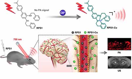 多項研究表明,大腦中二價銅離子的富集與“阿茲海默症"發病機制密切相關。透過光聲成像技術在腦部對二價銅離子進行成像,能為“阿茲海默症"的病理研究提供重要資訊。然而,目前光聲探針的設計是通過增加“分子的:-共軛體系",使光聲信號擴展到近紅外區,但增加“共軛體系"同時導致分子量變大,不利於探針穿越血腦障壁。有見及此,澳大健康科學學院助理教授張宣軍及其團隊研發出一系列“小分子光聲探針"(分子量小於440),能高選擇性地結合二價銅離子形成自由基,並在近紅外區顯示強的光聲信號,解決了分子量變大的憂慮。