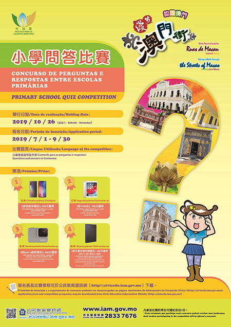 【特訊】為加深學生對澳門街區及歷史文化的認識,市政署將於十月二十六日舉辦“漫步澳門街”之“認識澳門”小學問答比賽,報名日期由即日起至九月三十日,歡迎全澳小學踴躍報名參與。
