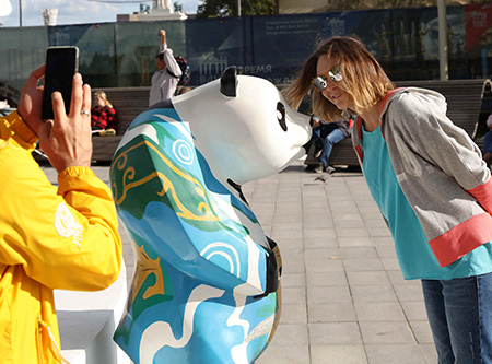 在全俄展覽中心露天廣場上,一個大型舞台已被搭好,台上古箏演奏、旗袍走秀、太極拳表演接連不斷;舞台周邊是一個個小亭子,裡面展示著書法、美食、瓷器等;離舞台不遠處,還進行著一場彩繪熊貓藝術展,主辦方希望把彩繪藝術和熊貓形象相結合,讓人感受到中國文化的藝術之美。