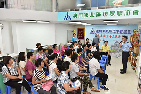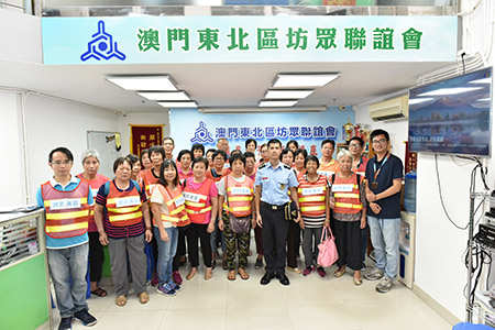 【為進一步加強市民對災害的防範意識和自救能力,保障市民於颱風期間風暴潮來襲時,能夠按照當局指示迅速、安全有序撤離,在警察總局統籌下,於2019年9月25日,消防局聯同社會工作局,透過向市民公開報名形式,於東北區坊眾聯誼會會址舉行「颱風期間風暴潮低窪地區疏散撤離計劃」講座,旨在加深居民對撤離工作的了解,及後進行演習撤離到避險中心,合共有約30名居民參與。