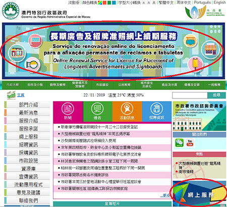 為秉持以民為本及持續改善的精神,由二零二零年一月一日起,“長期廣告及招牌准照-續期”服務推出網上續期的新措施,除親臨市政署各服務中心辦理外,持牌人只須使用已登記之一戶通帳號登入網上續期系統,按系統所示填妥簡單的資料,便可申辦准照續期。