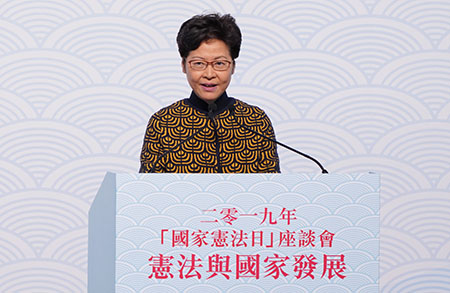 林鄭月娥致辭指出,憲法作為國家的根本法、最高法,是國家的重要標誌和象徵,具有最高的法律地位和權威。憲法亦是基本法的立法依據和效力來源,為香港的“一國兩制”“港人治港”和高度自治的基本方針政策提供了堅實的法理基礎和憲制依據。所以,我們一定要了解及尊重憲法的這個“根”和“源”。