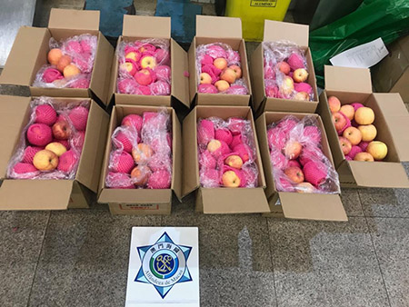 另外本月6日,一輛粵澳兩地牌私家車經關閘口岸車道入境時,經海關風險管理系統的預警分析,判斷為需接受詳細檢查,海關關員檢查私家車後排座位及車尾箱時,發現9箱未經檢疫的蘋果,合共80公斤。海關根據第40/2004號行政法規《衛生檢疫及植物檢疫》對涉案司機作出起訴,一經判罰,可科處貨物等值但不少於澳門幣1千元的罰款,而被查獲的貨物亦會宣告歸澳門特別行政區所有。