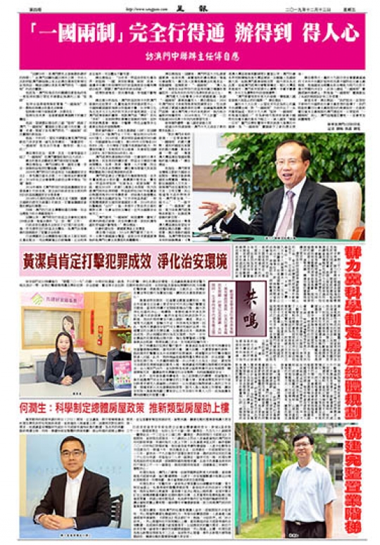 何潤生表示,宏觀而言,當局有必要落實出台總體城市規劃,著手制定涵蓋公、私營房屋的整體房屋政策。當局近年成功收回不少閒置地,既有足夠的土地資源,當局應下定決心增加公屋供應,並視乎需求訂定公屋興建數量規劃和定期供應的目標,且更重要的是嚴格監察工程進度質量,保證公屋如期落成,如此便有條件訂定明確的輪候時間表,讓合資格家團上樓有期,確保樓市平穩健康發展,致力保障澳門居民的置業需要。