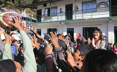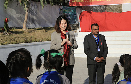 中國駐尼泊爾大使侯艶琪出席發放儀式。侯艶琪與該學校的學生們親密互動,向他們贈送了冬裝、文具和體育用品等物資。
