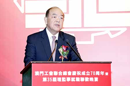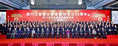 工聯總會昨晚舉行成立70週年暨第35屆理監事就職聯歡晚會,行政長官賀一誠,全國政協副主席何厚鏵,中聯辦主任傅自應,中華全國總工會副主席江廣平,外交部駐澳特派員公署特派員沈蓓莉,立法會主席高開賢及工聯總會會長何雪卿等出席。賀一誠在致辭時稱,習近平主席親臨澳門出席慶祝澳門回歸祖國二十周年大會並視察澳門,發表了一系列重要講話,提出要保持澳門社會講團結、重協商的傳統,有事多商量,做事多協調,妥善處理社會矛盾,共同維護社會祥和。特區政府將與澳門各界一道,按照要求,站高望遠、居安思危,守正創新、務實有為,在已有成就的基礎上推動澳門特別行政區各項建設事業躍上新台階。