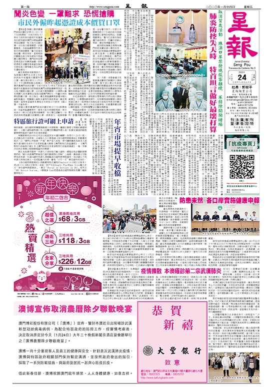 疫情擴散 本澳確診第二宗武漢肺炎