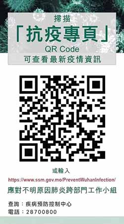 新型冠狀病毒感染應變協調中心抗疫專頁:https://www.ssm.gov.mo/apps1/PreventWuhanInfection/ch.aspx
