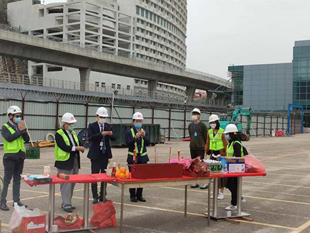 在防疫期間,相關的動工儀式於工地現場簡單進行,其後現場正式開展土地平整及樁基礎工作。項目團隊在施工過程中會密切留意工地的防疫及衛生情況,並會參考政府頒佈的各項公共防疫政策要求,制定有關項目工地之防疫措施,包括工程人員進入工地必須量度體溫及配帶口罩,工地會定時進行消毒清潔,在疫情期間人員必須留澳居住等。