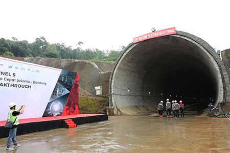 中印尼高鐵合資公司(KCIC)董事長詹德拉,監事會主席撒哈拉,雅萬高鐵承包商聯合體指揮長蕭頌新,中國中鐵印尼雅萬高鐵項目部總經理張偉,印尼公共工程部官員等出席當天在5號隧道施工現場舉行的貫通儀式。