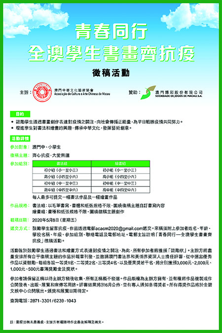 【特訊】由澳門中華文化藝術協會主辦、澳門博彩股份有限公司贊助的「青春同行 – 全澳學生書畫齊抗疫」徵稿活動現正展開,鼓勵莘莘學子留家抗疫期間,通過書法和繪畫方式表達對疫情之關注,向社會傳播正能量,為早日戰勝疫情共同努力,同時希望藉此活動增進學生對書法和繪畫之興趣,傳承中華文化,發揮藝術創意。
