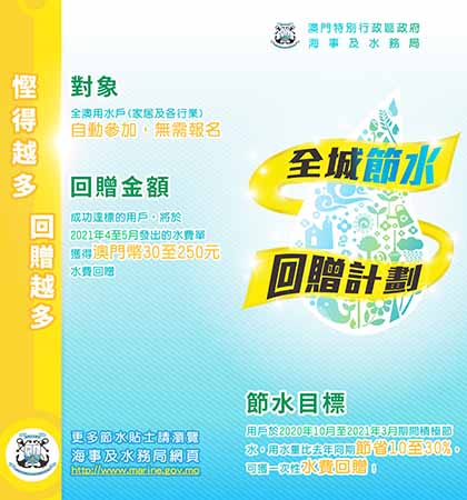 為推廣和鼓勵全澳家庭及各行各業節約用水,積極應對鹹潮威脅,海事及水務局再度推出全城節水回贈計劃。全澳自來水用戶於二○二○年十月至二○二一年三月期間,用水量只要比去年同期節約一成至三成,即可獲得水費回贈,回贈金額由澳門幣三十元至二百五十元。節水越多,回贈越多。
