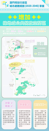 總規草案提出維持現時的大型全澳性綠地或公共開放空間,並於北區-2、東區-2、外港區-2及氹仔北區-1重點增加綠地或公共開放空間。