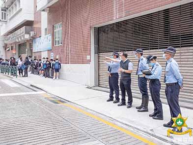 就學校附近的交通問題,治安警察局人員與各所學校負責人於上落課的繁忙時段,視察校外現場的學生人流、附近道路車輛行駛狀況以及學校周邊的泊車情況等,共同對有關情況進行交流及聽取校方的意見,透過各校負責人反映之日常問題,雙方積極探討改善措施。治安警察局將一如以往在繁忙時段加派人員維持交通秩序,同時加強宣傳教育工作,確保學生的出行安全及營造更安全的校園環境。另一方面,治安警察局向校方通報了近期涉及青少年的詐騙及性騒擾罪案情況,並向校方提供了防範建議,同時,校方應向學生灌輸防罪意識,遇有可疑情況或人士時必須提高警覺及自我保護意識。