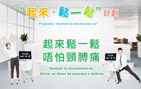 今年,受新型冠狀病毒肺炎大流行的考驗,居民強烈意識到擁有健康的身體是預防疾病的基石。有見及此,衛生局呼籲居民實踐規律運動的健康生活,並倡議社會各界共同展開“起來‧鬆一鬆”計劃,鼓勵所有單位設立規律工間操政策,給員工提供一個支持運動的工作環境,助其養成規律運動的習慣,促使本澳居民健康,攜手共建健康澳門社區。如需了解計劃詳情,可瀏覽網頁https://www.ssm.gov.mo/apps1/healthymacao2019/ch.aspx#clg18083;或致電85041479