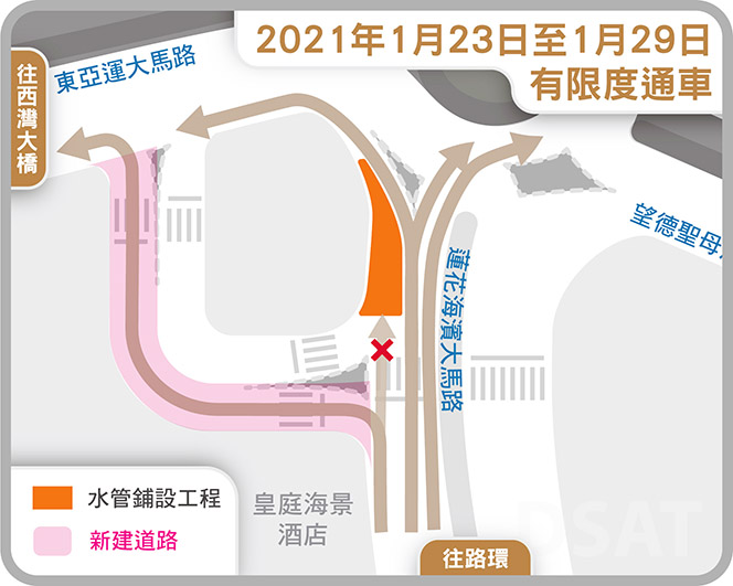 1月29日至2月10日(有限度通車)新建道路與東亞運大馬路之間的一段蓮花海濱大馬路。