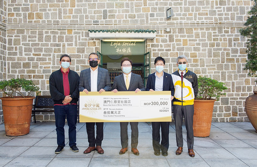 王英偉博士於2月5日代表公司向澳門仁慈堂社服店捐贈澳門幣30萬元善款,支票由澳門仁慈堂主席飛安達、值理會值理李維士代表接收;威尼斯人澳門股份有限公司企業傳訊及社會事務副總裁沈頌年以及澳門街坊會聯合總會會長吳小麗等在場見證。
