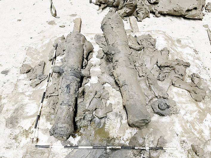 【特訊】就在澳門銀河酒店施工地盤新發現之古炮,文化局完成對現場環境及該出土物狀態等詳細記錄,包括對古炮出土物及其發現位置進行儀器定位及三維掃描。經測量後第一門古炮的長度約為1.08米,口徑約為60毫米;第二門古炮的長度約為1.3米,口徑約為60毫米,且該炮出土時炮口帶有一木質蓋狀物。
