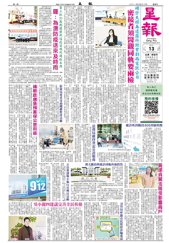 【特訊】旅遊局表示,鑑於近期澳門出現新冠肺炎的輸入及關聯個案,為配合特區政府當前的防疫工作,根據衛生局於二○二一年八月十日發出的「關於舉辦外訪及人群聚集活動的指引」,旅遊基金已通知相關受資助實體要求其取消或暫停舉辦由旅遊基金資助的外訪活動,以及聯誼、康樂、表演、培訓、講座、研討會等可引致人群聚集的活動,直至另行通知。