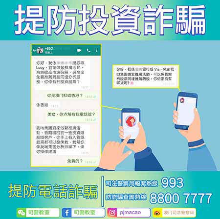 鑑於早前本澳曾發生類似的投資騙案,加上騙徒作案手法層出不窮,故司警局再次發出預警提醒市民,進行投資前必須提高警惕,以免墮入騙局,如有疑問應向相關監管機構查詢。