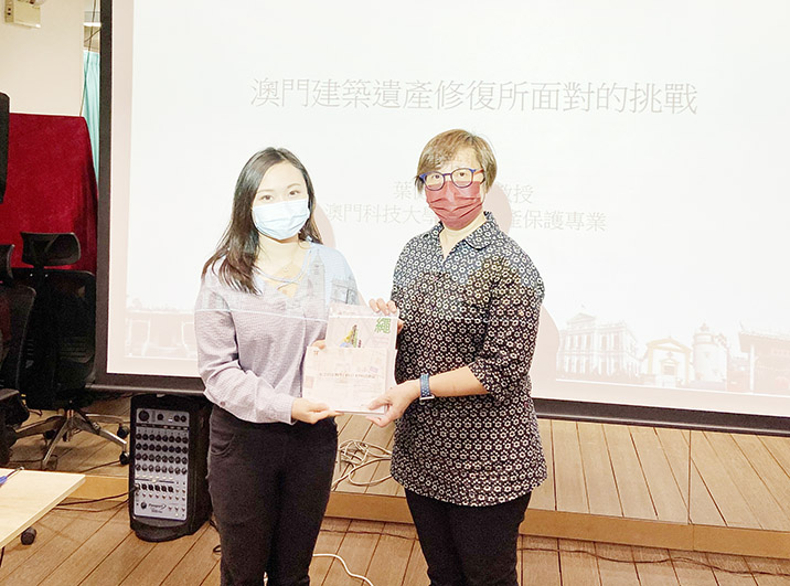 課堂上,導師解釋了文物修復的定義及常用的專業術語,並向學員介紹了文物修復領域當下的發展前沿,同時亦以大三巴牌坊為例,介紹了澳門文物修復工作的現況。當中導師著重指出,“澳門歷史城區”保存了澳門四百多年中西文化交流的歷史精髓,眾多的遺產建築是本澳乃至世界不可多得的珍貴文物資源,但隨著歷史的發展,遺產建築面對的環境因素越來越多,包括氣候變化、填海造地、城市化、人為干預等,對保存遺產建築而言都是重大的挑戰,因而令澳門的文物修復工作任重道遠。