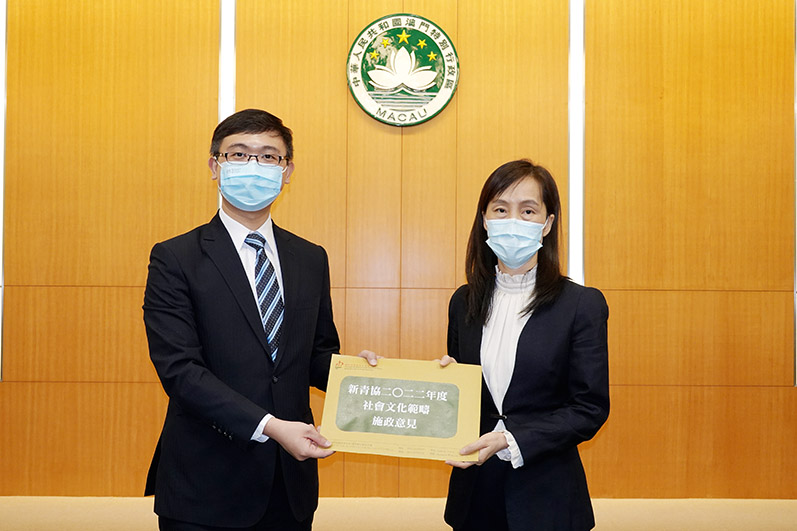 【特訊】日前,澳門中華新青年協會一行聯同澳門青年聯合會、澳門中華學生聯合總會拜訪社會文化司,獲司長歐陽瑜接見,雙方就青年發展、青年服務、體育發展等議題交流意見。會上,新青協會長周永豪向司長遞交2022年度施政建議。他表示,隨著深合區總體方案和《澳門青年政策(2021–2030)》的實施,青年發展的重要性愈加突出。深合區為澳門青年帶來龐大的發展機遇,新青協願與特區政府一同做好青年工作,鼓勵青年提升自我競爭力,推動青年成功、成長、成才,融入國家發展大局。