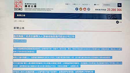 【特訊】香港廉政公署網頁發佈,香港廉署與香港財務匯報局(財匯局)上星期採取代號「狙擊手」聯合行動,搜查一間會計師事務所及其同系公司的辦公室。該地址亦是一間在港上市澳門建築公司的香港登記業務地址。
