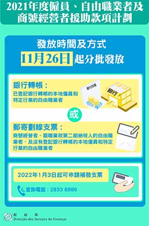 根據第39/2021號行政法規《2021年度僱員、自由職業者及商號經營者援助款項計劃》的規定,2020年度工作收入不超過144,000元的本地僱員,以及6類特定行業的自由職業者,可獲發放每人10,000元的援助款項。
