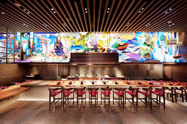 廚房採用開放式設計,巧妙融合了傳統壽司製作工藝與當代日本藝術壁畫,令廚師精心備餐的過程如舞台劇般富有觀賞性。開放式廚房分為獨立的壽司刺身吧台,天婦羅和鐵板燒區域。此外,餐廳還設有一間寬敞的私人包廂以及兩間鐵板燒包廂,食客可近距離感受東瀛大師的傳奇廚藝。