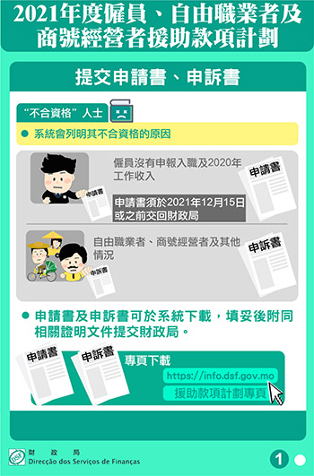 其他對發放結果有異議者,可於專頁( https://info.dsf.gov.mo )下載申訴書,填妥之後附同證明文件向財政局提交。