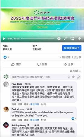 2022年度澳門科學技術奬勵已於2021年12月15日開始接受申請。為了讓科技界對有關獎勵以及申請安排有更多了解,科學技術發展基金於今天下午舉行了“2022年度澳門科學技術奬勵說明會”線上直播,說明會由科技基金陳允熙主席、葉桂林委員、陳躬安高級經理主持,進入直播的連接近70個。