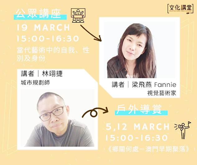 為豐富《文化講堂》的主題內容與公眾參與形式,拓闊文化想像與視野,3月將首度開辦關於氹仔城區發展的導賞《鄉關何處—澳門早期聚落》,在澳門城市規劃師林翊捷引領下,由氹仔中葡學校(氹仔巴波沙總督前地)出發,在氹仔城區內穿街過巷,尋找城市發展的足跡與印記,兩場戶外導賞分別於3月首兩個周六(5日及12日)下午3時舉行;講座《當代藝術中的自我、性別及身份》將於3月19日(星期六)下午3時在紐曼樞機藝文館(得勝斜路55號地下)舉行,視覺藝術家梁飛燕與公眾一同進入視覺藝術的世界,瞭解當代文化符號與美術作品背後,其所隱含的平等權利與自我意識的覺醒,藝術家探索自我身份與文化認同的歷程及發展。