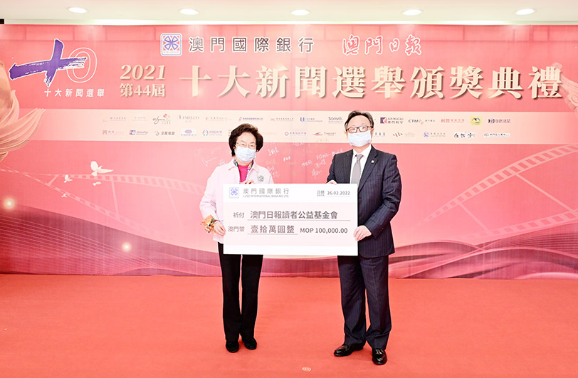 頒獎典禮上,焦雲迪代表澳門國際銀行向澳門日報讀者公益基金會送交10萬元善款支票,用於支持本澳慈善公益事業,由澳門日報讀者公益基金會會長賀定一代表接收。