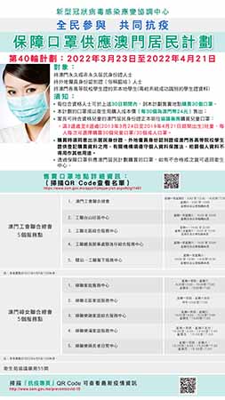 【特訊】新型冠狀病毒感染應變協調中心昨日(22)日公佈,第40輪保障口罩供應澳門居民計劃(下稱“口罩計劃”)於今日(23)日開始,售賣期間為30日,即2022年3月23日至2022年4月21日,期間每人可一次性購買30個口罩,售價合共24澳門元。衛生局協議藥房、本澳2個社團(工聯、婦聯)繼續提供售賣口罩服務。即全澳共有65個售賣點,服務時間詳見附圖。透過口罩計劃購買的口罩,如有不合格或次貨可退回衛生中心。