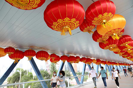 在香港知名的利東街,中華人民共和國國旗和香港特別行政區區旗迎風飄揚,一片火紅,分外喜慶;慶祝活動“仲夏·維港”日前在海濱啟動;中環碼頭附近的長廊掛上了許多紅燈籠……