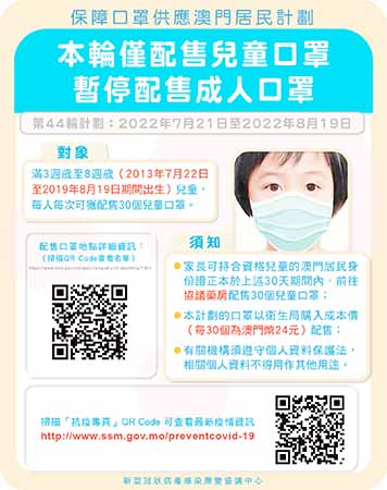 【特訊】新型冠狀病毒感染應變協調中心(下稱應變協調中心)公佈,第44輪保障口罩供應澳門居民計劃今日(21)日開始,配售期間為30天,即2022年7月21日至2022年8月19日,期間僅配售兒童口罩,暫停配售成人口罩,敬請留意。
