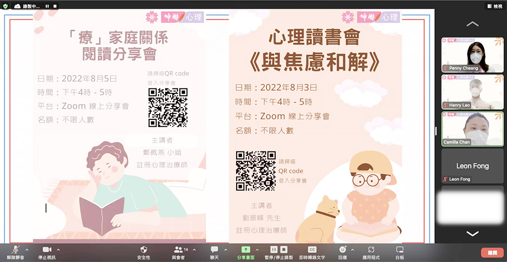 【特訊】婦聯心理治療中心於七月底至八月初舉行四場線上講座,分別由該中心的澳門註冊心理治療師劉振峰、鄭佩燕、陳雪盈和馮正安主講,主題包括疫情下的壓力管理及紓緩、親子相處錦囊及有關焦慮、家庭關係的閱讀分享等有關心理健康的資訊,旨在為受疫情影響的市民提供情緒及家庭關係上的支援,以正能量面對“疫”境。