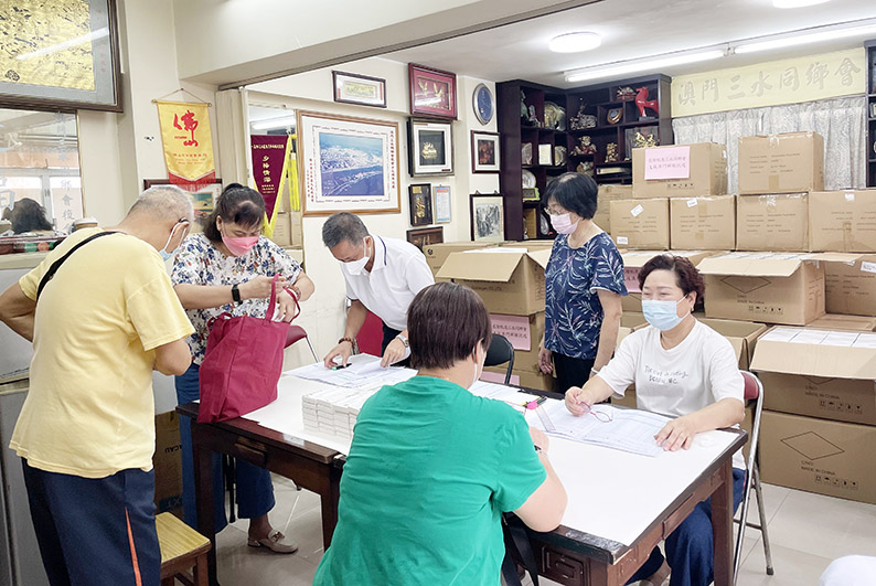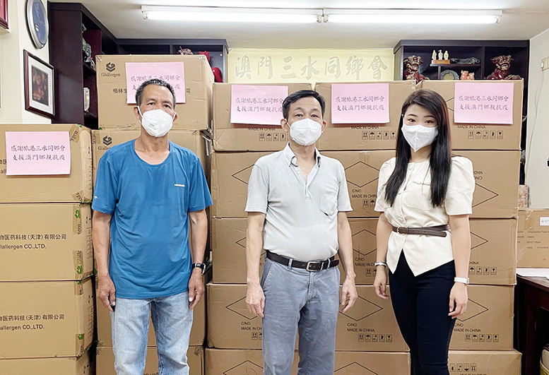 旅港三水同鄉會送贈予澳門鄉親6900套新冠病毒快速測試劑及57500個KN95口罩,包裝成超過1150份內含6套新冠病毒快速測試劑及50個KN95口罩的抗疫包,並已分4天在本會會址免費派贈予澳門三水同鄉會及澳門三水青年協進會全體會員,用實際行動與會員攜手抗擊疫情。