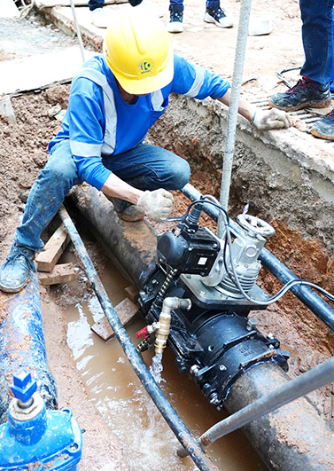 隨著本澳社會及經濟發展對用水需求不斷增加,為降低因管道工程需要暫停供水對周邊居民及工商業用戶帶來的不便,澳門自來水不斷尋找更適合本澳繁忙道路的施工方案。2019年首次引入內套管技術,成功於繁忙要道下對老舊管道進行修復。今年,公司先後在大三巴街、大炮台斜巷、馬六甲街等地區,經評估不具長時間停水條件的供水管道,採用帶水施工技術增加管道閥門。