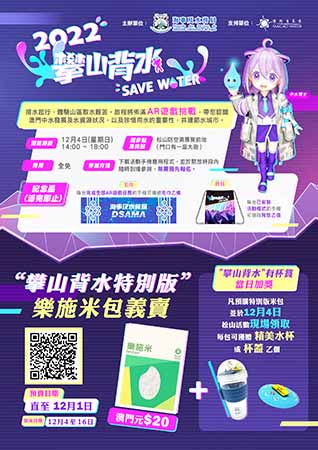 同時,海事及水務局與樂施會今年首次合作,推出“攀山背水特別版”樂施米,每包$20澳門元,即日起至12月1日線上義賣;凡預購並於“攀山背水”活動現場領取,每包可獲贈由海事及水務局送出的精美水杯或杯蓋乙個。