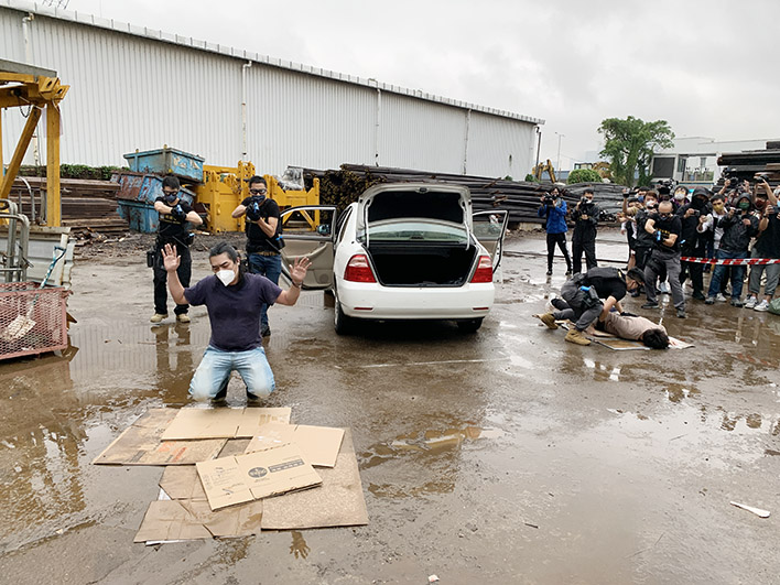 演習昨日分別在司警局總部大樓及路環聯生工業邨進行,模擬有一名女大學生在校內被兩名男子強行押上一輛客貨車載走,該校即循學校安全聯絡網機制向司警局通報案件,局方接報後啟動嚴重案件指揮中心機制,行動指揮官迅速調動多部門人員,全力展開調查及營救工作。