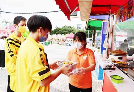 師生們在環保局吉祥物地球先生、綠樹太太的帶領下,以自備的餐具、水樽及環保袋,於美食節適量購買食物,身體力行實踐「源頭減廢」。環保局人員並向師生們介紹廚餘回收以及資源垃圾分類回收的流程及相關知識,氣氛相當熱烈。