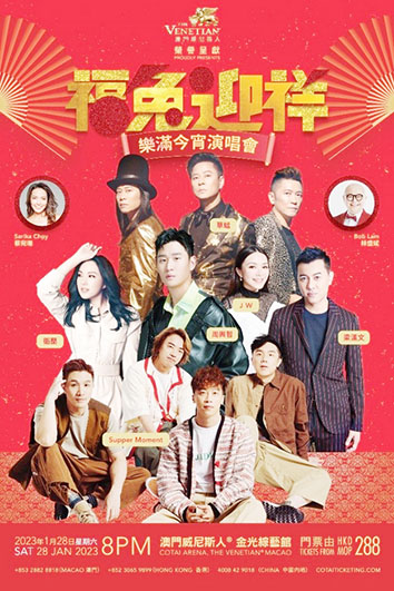 【特訊】2023年1月28日(年初七),《福兔迎祥—樂滿今宵演唱會》將於澳門威尼斯人®金光綜藝館隆重舉行,一眾知名歌手齊齊唱旺瑞兔年,讓樂迷大飽耳福。