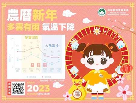 氣象局表示,臨近歲晚,天氣乾燥晴朗。然而,由除夕夜開始,本澳將轉受一股偏東氣流影響,天色漸轉多雲,預料年初一及年初二有幾陣微雨,天氣較清涼。氣象局預料年初二晚,另一股冬季季風將抵達華南沿岸,屆時北風增強,年初三及年初四早上最低氣溫將再度降至寒冷水平(攝氏十度左右),日間雲量減少有陽光。新春佳節乍暖還寒,時而有微雨,時而有陽光,氣溫變化大。氣象局提醒市民出門前留意天氣變化,適時帶備雨具及增添衣物,平安健康迎「兔」年。