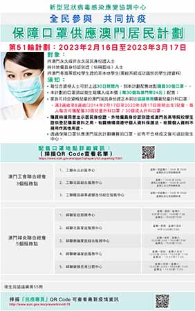 【特訊】新型冠狀病毒感染應變協調中心昨日(13)日公佈,第51輪保障口罩供應澳門居民計劃(下稱“口罩計劃”)於2月16日開始,配售期間為30日,即2月16日至3月17日,期間每人可一次性購買30個口罩,售價合共24澳門元。衛生局協議藥房、本澳2個社團(工聯、婦聯)繼續提供配售口罩服務,即全澳共有63個配售點,服務時間詳見附圖。透過口罩計劃購買的口罩,如有不合格或次貨可退回衛生中心。