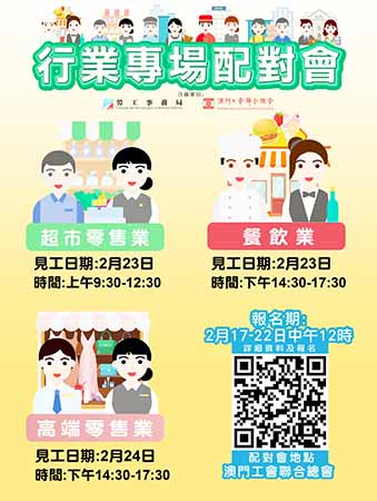 【特訊】為舒緩業界人資需求壓力,以及為協助有求職需求的澳門居民盡快就業,勞工事務局與澳門工會聯合總會合作,2月23日至24日舉辦3場行業專場配對會,合共提供266個空缺。可由2月17日起至22日中午12時,登入勞工局行業專場配對會專頁(https://www.dsal.gov.mo/zh_tw/standard/indjobfair.html)報名,名額有限,額滿即止。