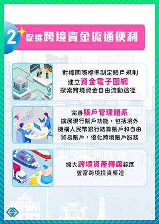《意見》提出將對標國際標準制定賬戶規則,優化改造自由貿易(FT)賬戶系統,通過金融賬戶隔離,在深合區建立資金電子圍網,並將制定電子圍網跨境資金流動政策,優化跨境資金清算渠道,探索跨境資金自由流動途徑,將可突破目前澳琴跨境資金流動的部份限制。