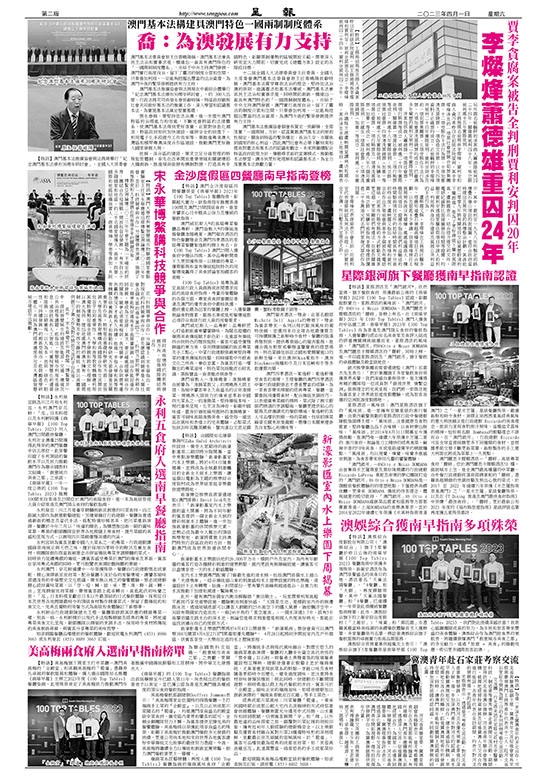 【特訊】永利皇宮路氹川江月和永利宮、永利澳門京花軒、「泓」日本料理以及永利軒同獲《南華早報》《100 Top Tables 2023》列入澳門 25 間最佳餐廳。永利在全澳僅 25 間獲得此殊榮的澳門餐廳中佔五席位,此榮譽印證了永利頂級的餐飲水平以及致力推動澳門作為聯合國教科文組織 –「創意城市美食之都」之承諾。《南華早報》一年一度公佈的《100 Top Tables 2023》推薦 10
